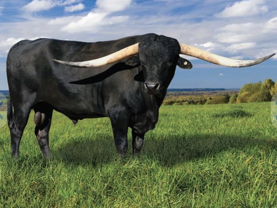 The TLBAA Horn Showcase people's choice award 2022 ULTIMATE BULL! 🏆 & our current herd sire we had the privilege to purchase from Lyz and JD White. He is a solid black son of 90.37” ttt JH RURAL SAFARI SON with JH Thirty Kay of Cold Copper Cattle Company as his dam! She is one of the most beautiful animals in the breed with over 128.5" of total horn & closing in on 100” ttt!. She is a many time Horn Showcase Champion. His calves are on the ground now with beautiful black and white colors! The sky is the limit with this total outcross package herd sire, COLOR! HORN! Correct conformation & BIG size everyone loves! 80% of his calves are Black or Black and White. Straws available. Contact Ron or Reida Baca at 505-860-2763.