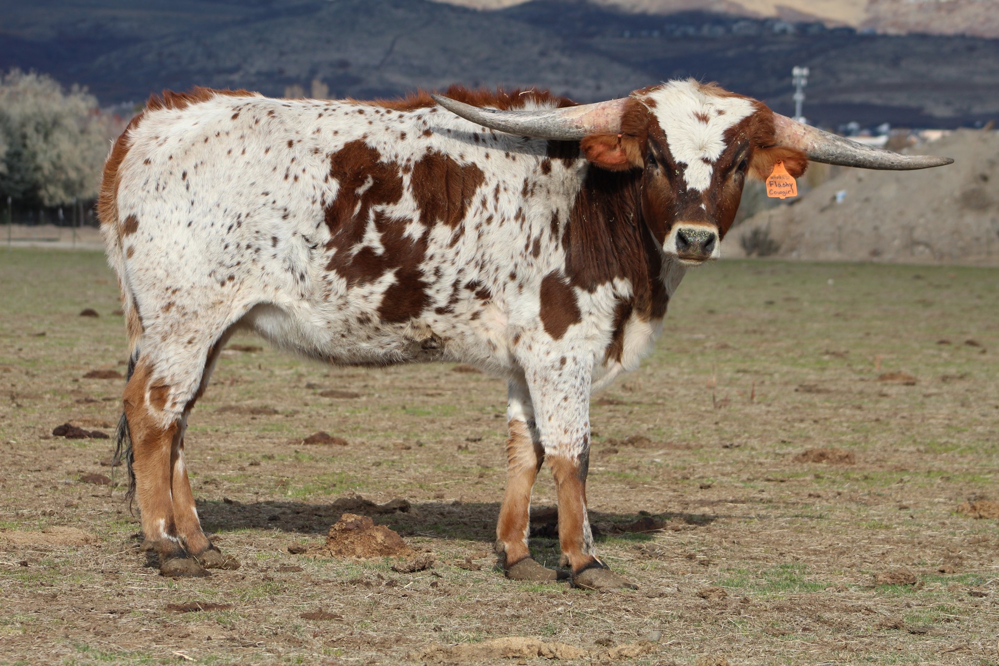 Flashy Cowgirl is the nicest heifer calf that was born on the ranch in 2021. She is a great example of the specks that Cowboy Flair is putting on his offspring. She has an amazing horn set for her age and is going to produce nicely for us. She was AI'd to Rebel HR on 9/30/2023.