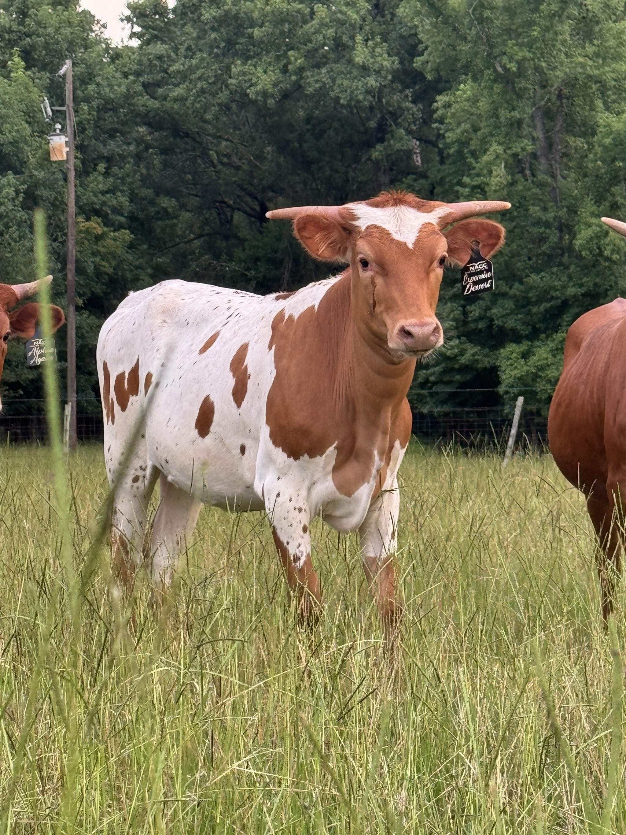 This heifer is one we are very excited to join our herd, daughter of BANKER who is over 91"TTT @ 39 months old, son of TEXACO who needs no introduction, and out of the 91"TTT CLEVER ME. The explosive genetic makeup also includes the almost 102"TTT TEXA-PPEAL, TEJAS STAR, 108"TTT COWBOY TUFF, DRAG IRON, FORMAL ATTIRE, TEMPTER, 101"TTT HORSESHOE J EXAMPLE, DRAGON LADY, FIFTY-FIFTY, and the list of legends goes on and on. Her horns are set back with a lateral twist, super nice conformation, and beautiful markings. Excited about her future with us and the industry.