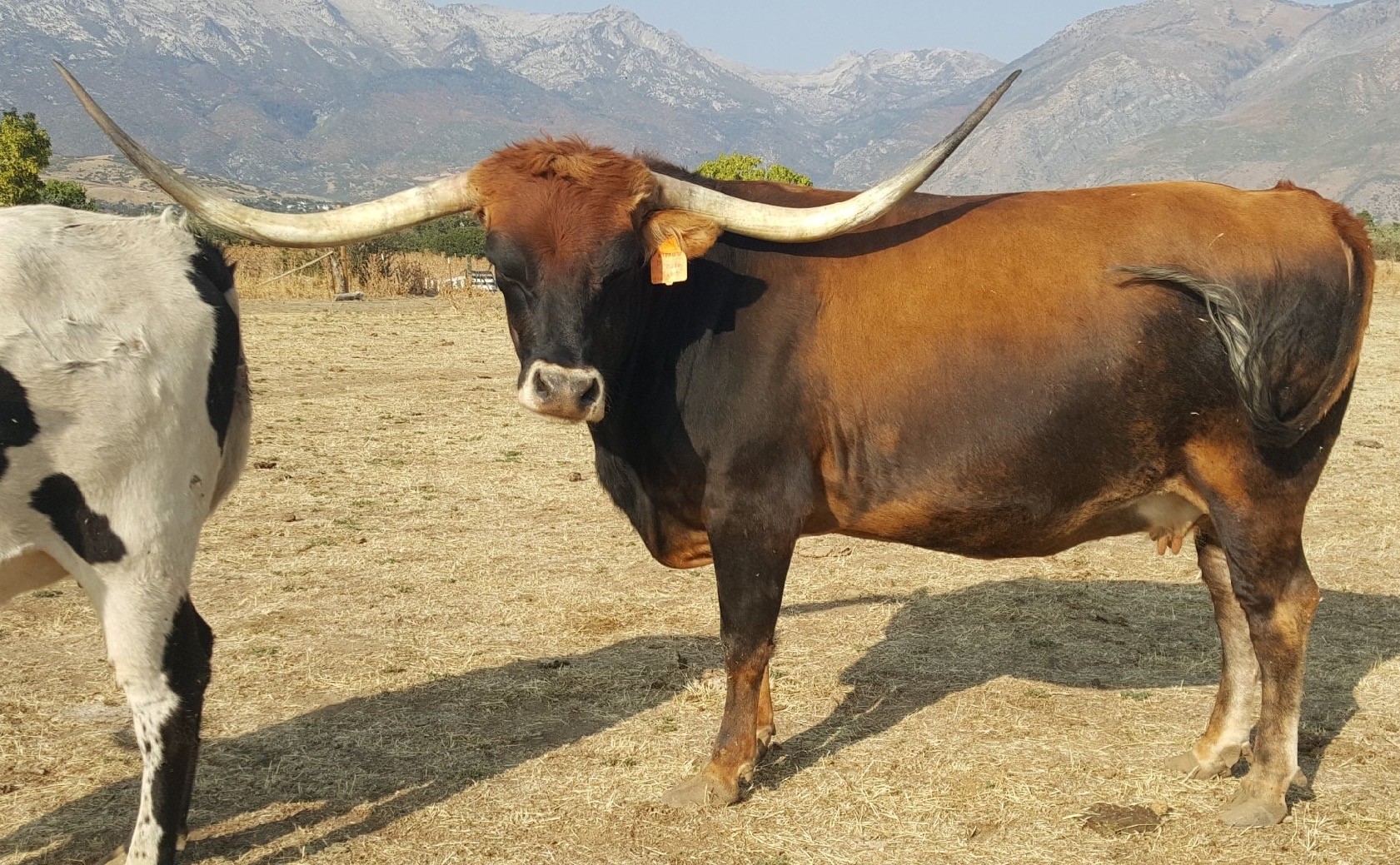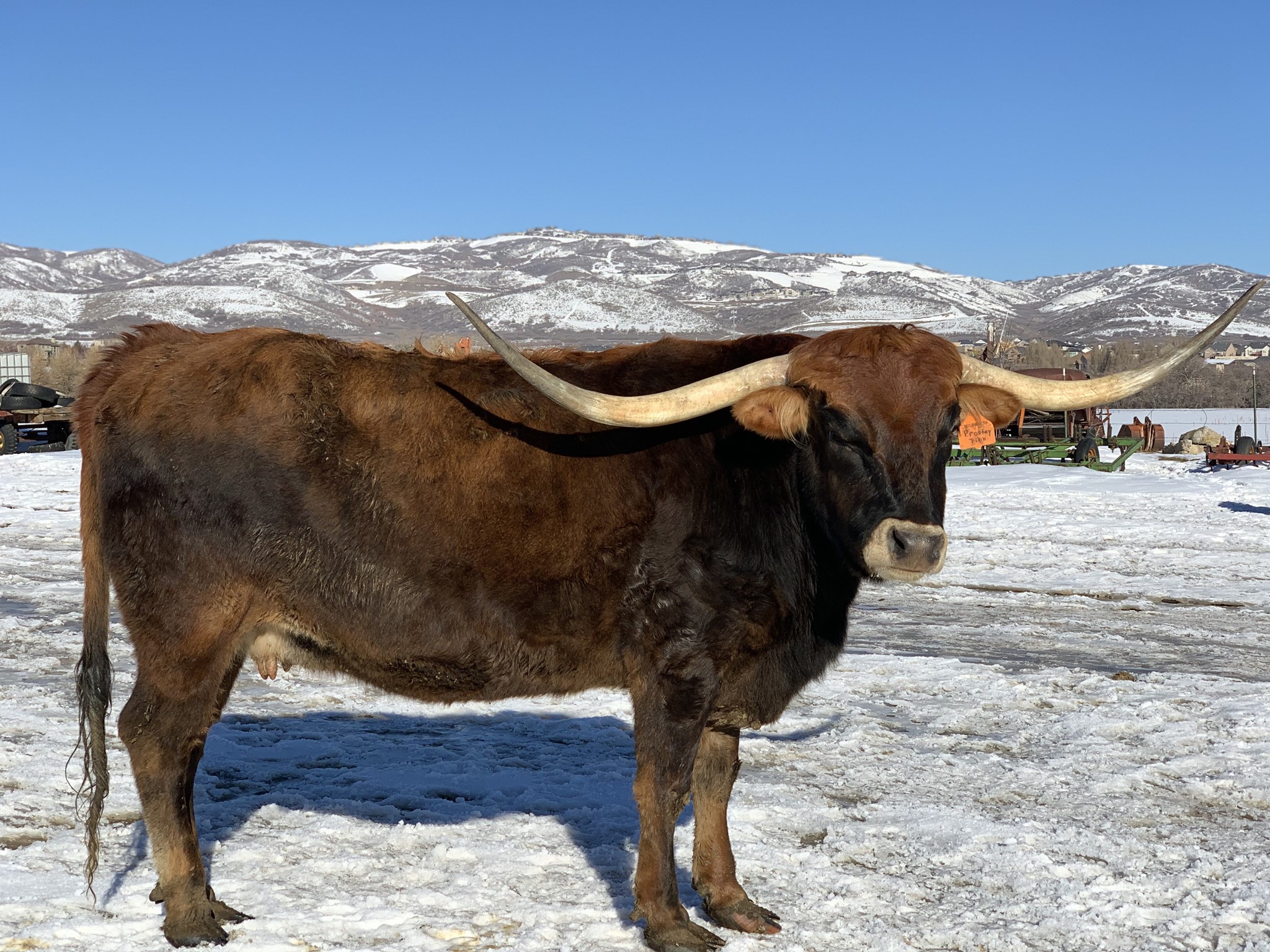 Prostey Tibb is a beautiful parker brown that is just beginning to melt into that beautiful coat. She had extreme backward and downward horn direction when she was young, and Darol said it was the most extreme he has ever raised. The beautiful thing is she's throwing that same horn shape on all of her offspring. Prostey Tibb gave us a beautiful Saddlehorn heifer on July 8, 2018. She is a beautiful black and white paint color that is a knock out! We named her Side Saddle. In 2019 she gave us a beautiful black with frosty specks also out of Saddlehorn that we are thrilled with as well. In 2020 & 2021 she gave us beautiful bull calves out of Cowboy Flair that have a chance to be a herd sire. She is bred back to Cowboy Flair for a Fall 2022 calf.